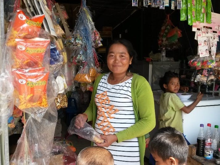 Few months later, there was a village plot, where she is living on nowadays, on sale which cost KHR 800,000 (USD 200) and she wanted to buy it, but she had only KHR 500,000 (USD 125) in hand. Finally, she decided to borrow KHR 300,000 (USD 75) from relatives to add up with her savings to buy that village land. She and her husband did not immediately construct home to live there, but after some months they had enough savings to build a small hut. After moving into that hut, she had no money in hand, but she really want to sell groceries in front of her home to make additional income to add to her husband’s earnings.